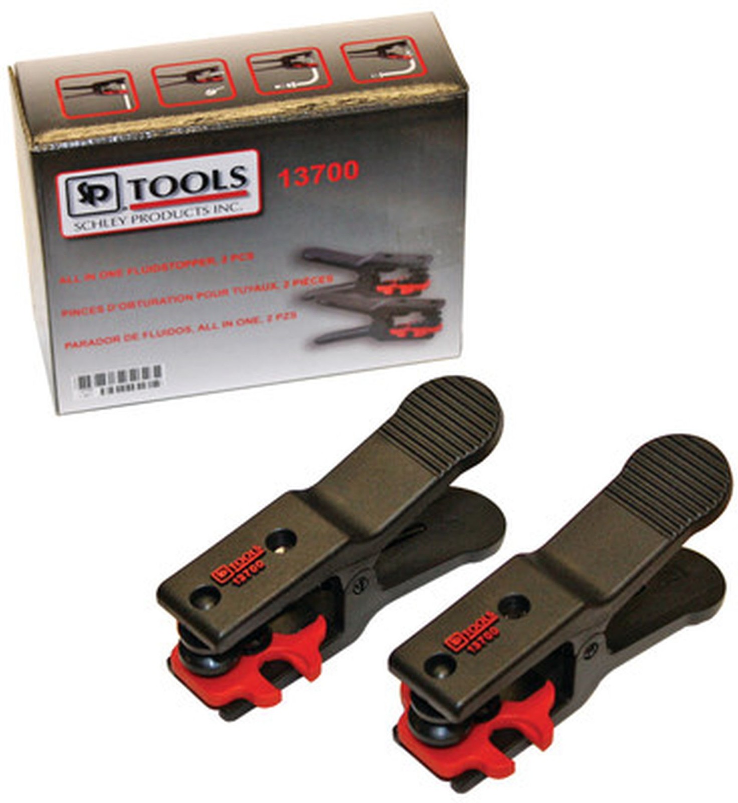 The SP Tools All-in-one Fluid Stopper 2-pc Set, No. 13700, allows technicians to stop fluid draining from various lines found on vehicles, heavy duty trucks and equipment. These clamp style stoppers feature four different sizes for various applications including brake lines, hydraulic lines and smaller coolant lines. This set features four sizes in one compact clamp: 8mm, 10mm, 12mm and banjo. These tools are constructed of high-quality composite plastic and provide a quick and easy way to stop dripping lines.