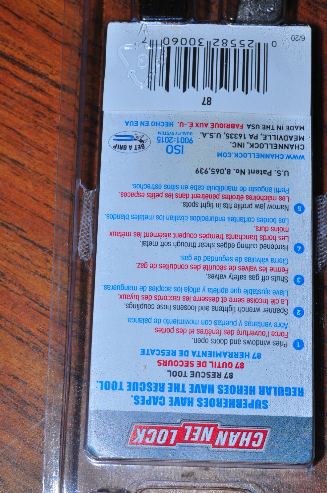 As a first responder, your job requires tools that are reliable and versatile. The CHANNELLOCK® 87 9″ Rescue Tool pries open windows and doors, cuts wires and cables easily, shuts off gas safety valves and loosens hose couplings. Made from high alloy steel that is specially coated with the ultimate rust preventative. U.S. Patent No. 8,065,939.