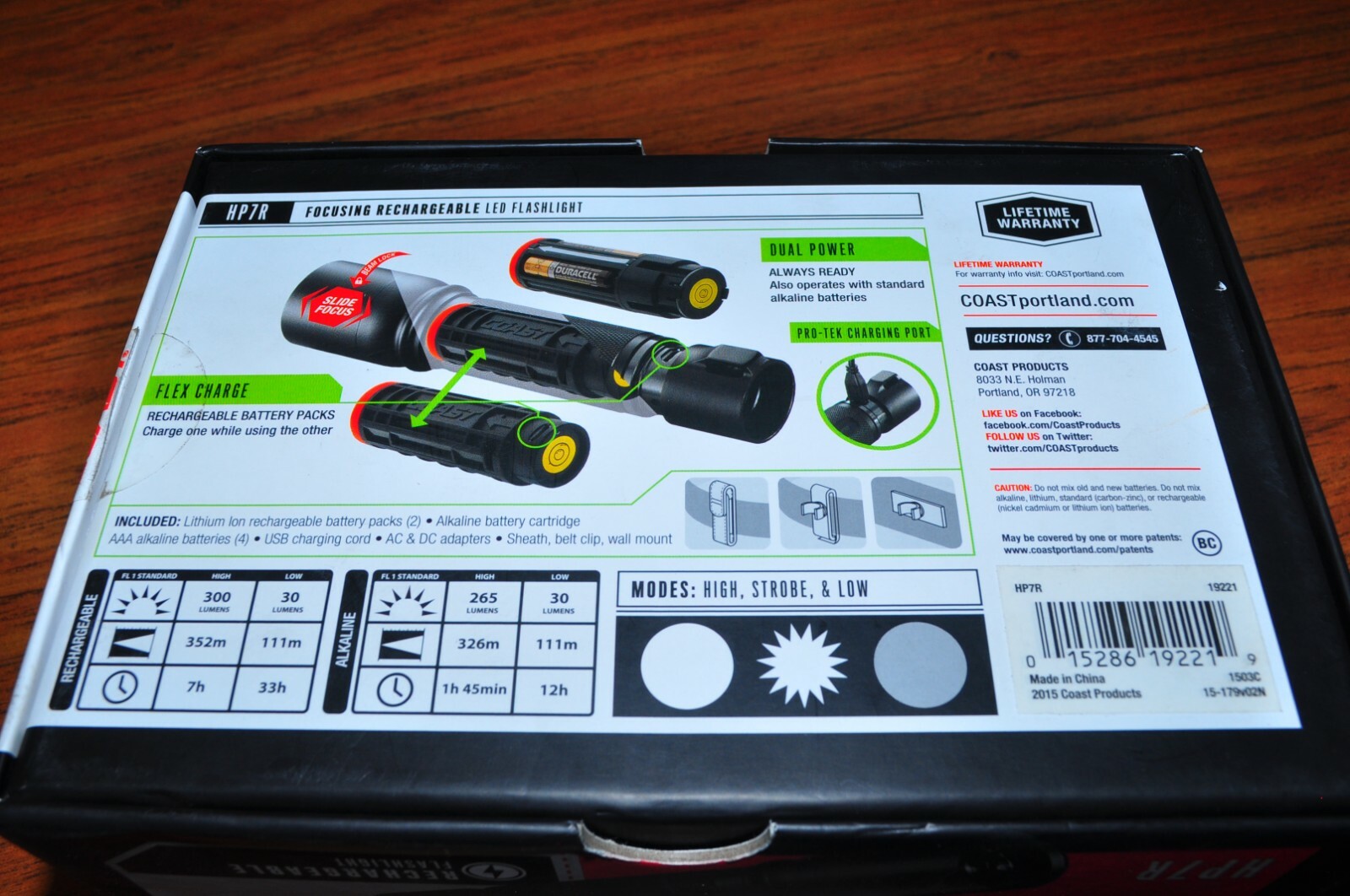 The HP7R rechargeable flashlight has a beam distance of up to 306 meters (1,003 feet), making it an excellent duty light for all types of tactical, rescue, and law enforcement professionals.  Our Flex Charge Dual Power system allows you to charge using AC, DC or USB power sources and also includes an alkaline battery pack, allowing you to continue using your light, even without access to charging power.  A second rechargeable battery pack is included which can be charged outside of the light so you can always have one ready. A quick cycle switch allows you to select between a high output setting of 201 lumens, a high powered strobe mode, or a low output of 22 lumens. Coast’s Long Range Focusing Optic System with Speed Focus Control provides superior beam consistency from spot to flood, with no dark rings typically associated with focusing flashlights.  Built tough, an impact-resistant, lightweight aluminum casing resists rust and corrosion. The HP7R also features an unbreakable LED and rubberized O-ring for reliable water resistance and durability. Backed by Coast’s lifetime guarantee against defects in materials and workmanship.Tested and rated to ANSI/FL1 standards by an independent laboratory.