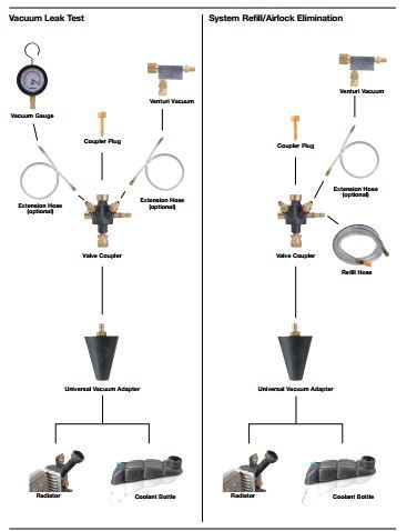 • Universal adapter forms an airtight seal with all radiator and coolant bottle necks. No custom adapters are required.