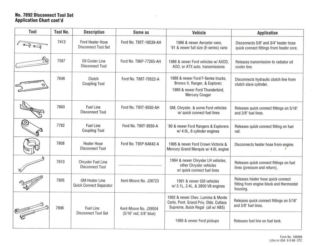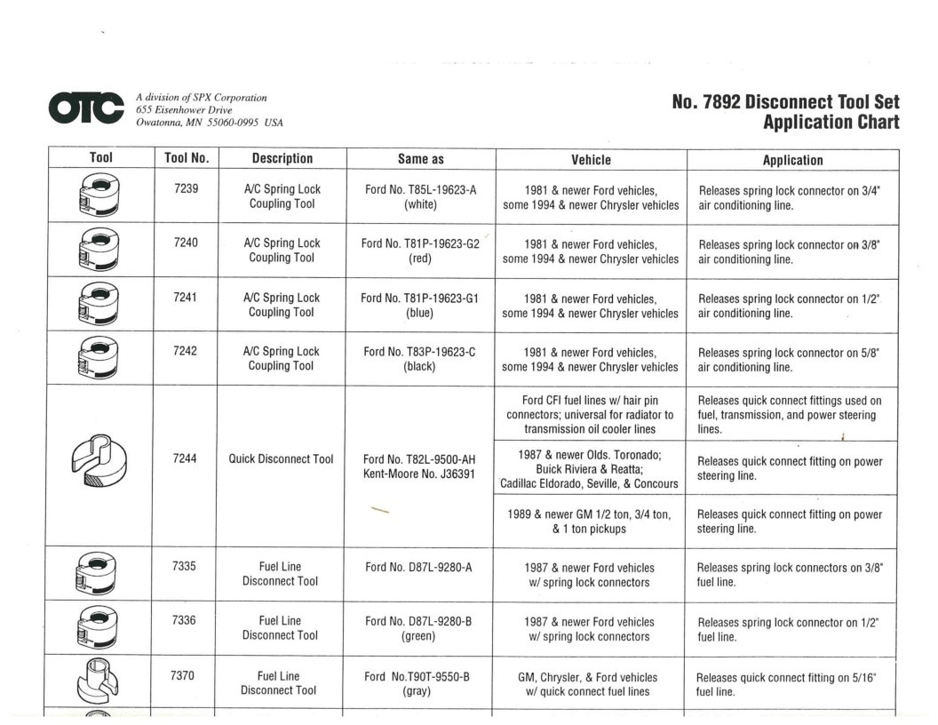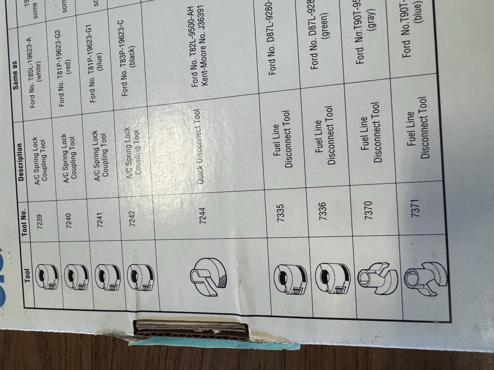 5.Tool no.:7239,7240,7241,7242,7335 and 7336 are used on Ford air conditionand fuel lines. they are spring load.in the closed      position to deflect  any spraythat occurs when the line ism disconnected.