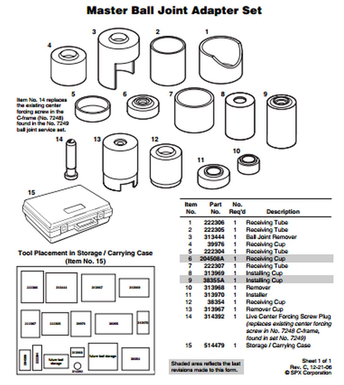 This set was created specifically to expand the capability of your No. 7249 ball joint service set. It includes all the receiver tubes and removing/installing adapters needed to work on press-fit upper and lower ball joints on most GM, Ford, and Dodge 2- and 4-wheel-drive pickups, vans, and sport utility vehicles, through 1997.