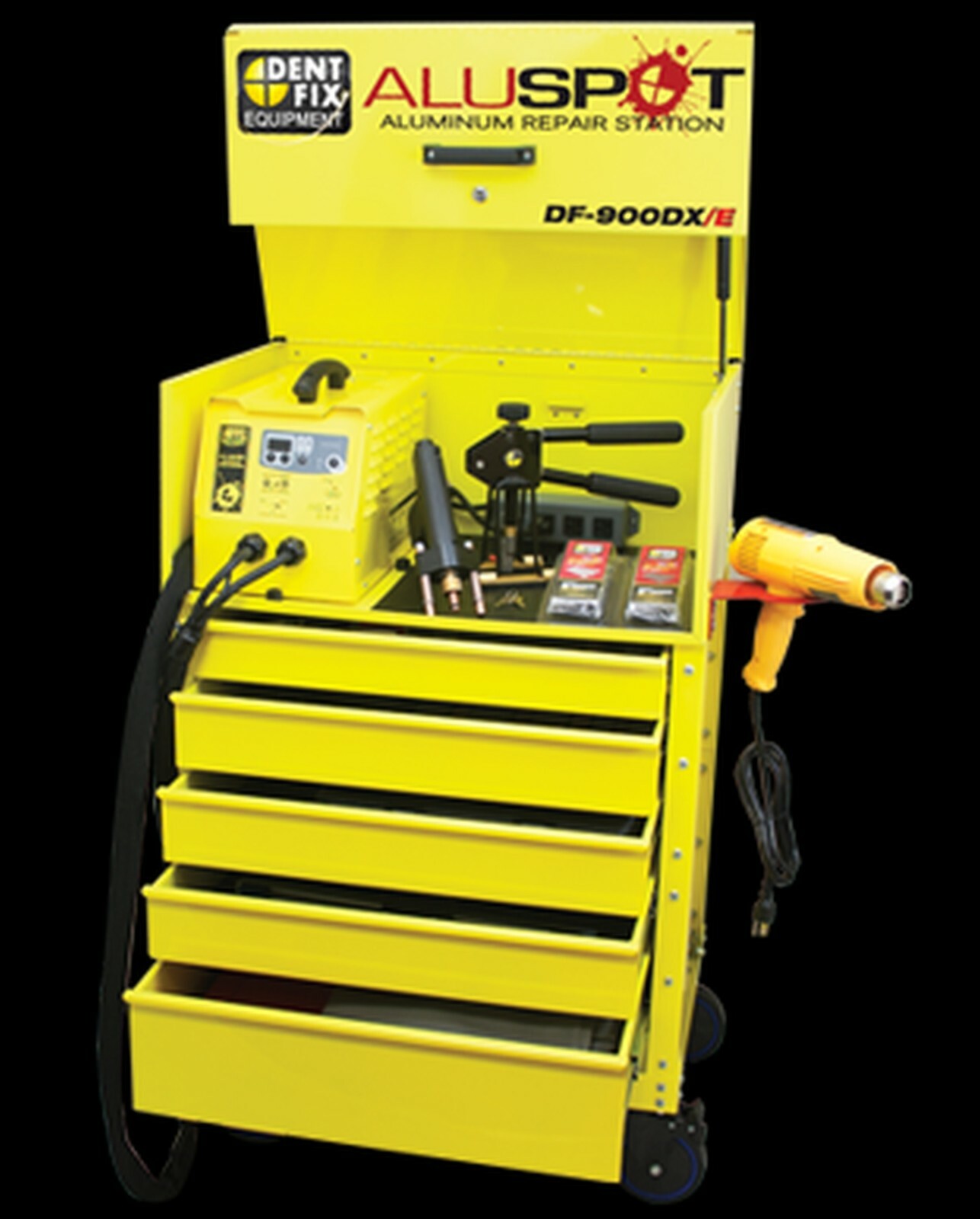 The DF-900DX/E Aluspot Extended includes everything that the Ford Approved Aluspot (DF-900DX) does PLUS Aluminum-Head Hammer Set (DF-AH714), POM Nylon Dolly Set (DF-AB712), two more storage drawers, an in-cabinet electrical power strip, and a holster on the side of the cabinet to hang the heat gun.