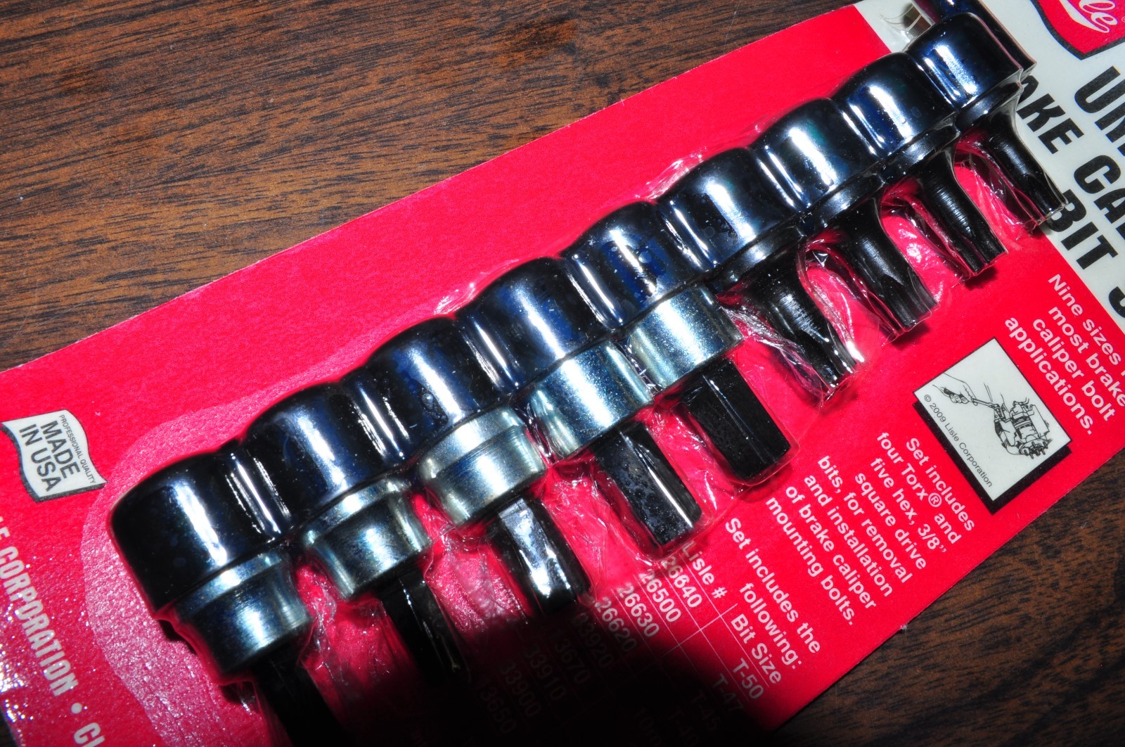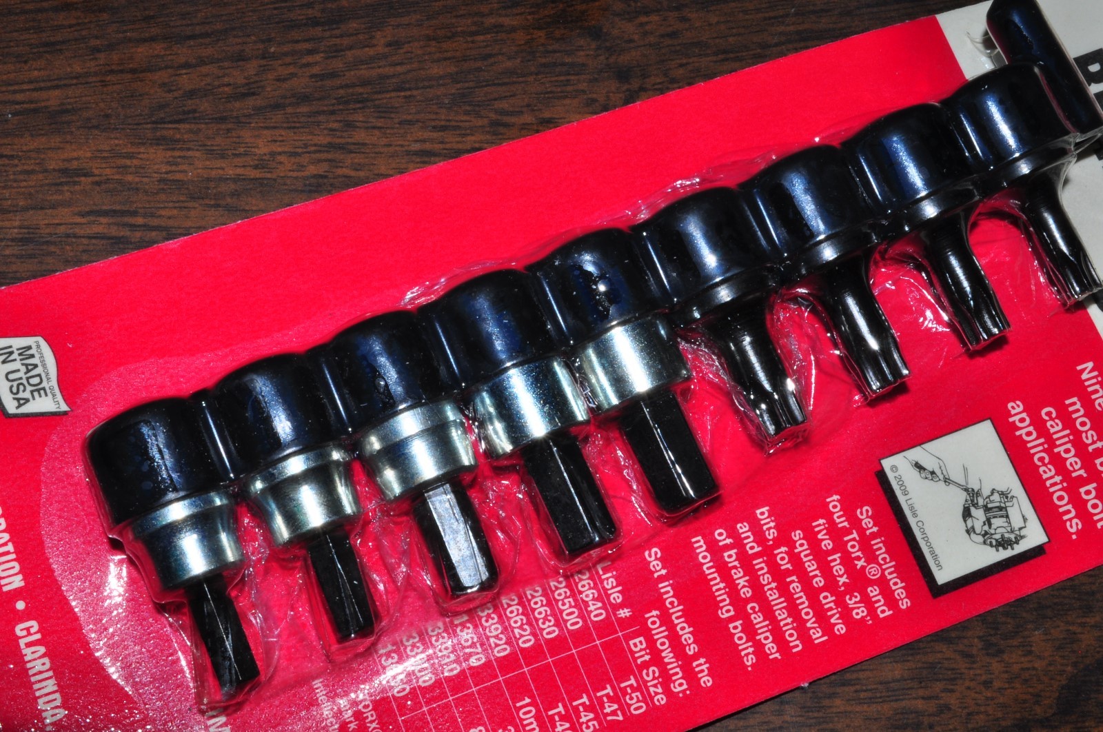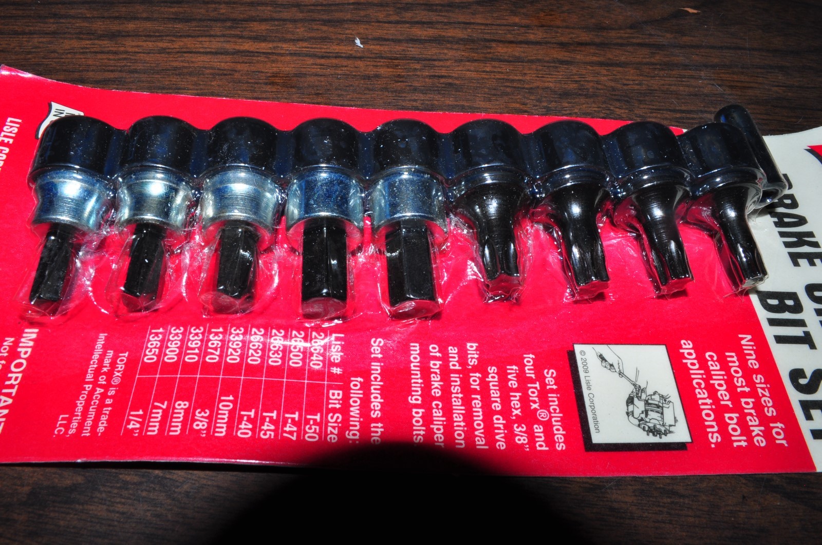 Set includes four Torx and five hex bits for removal and installation of brake