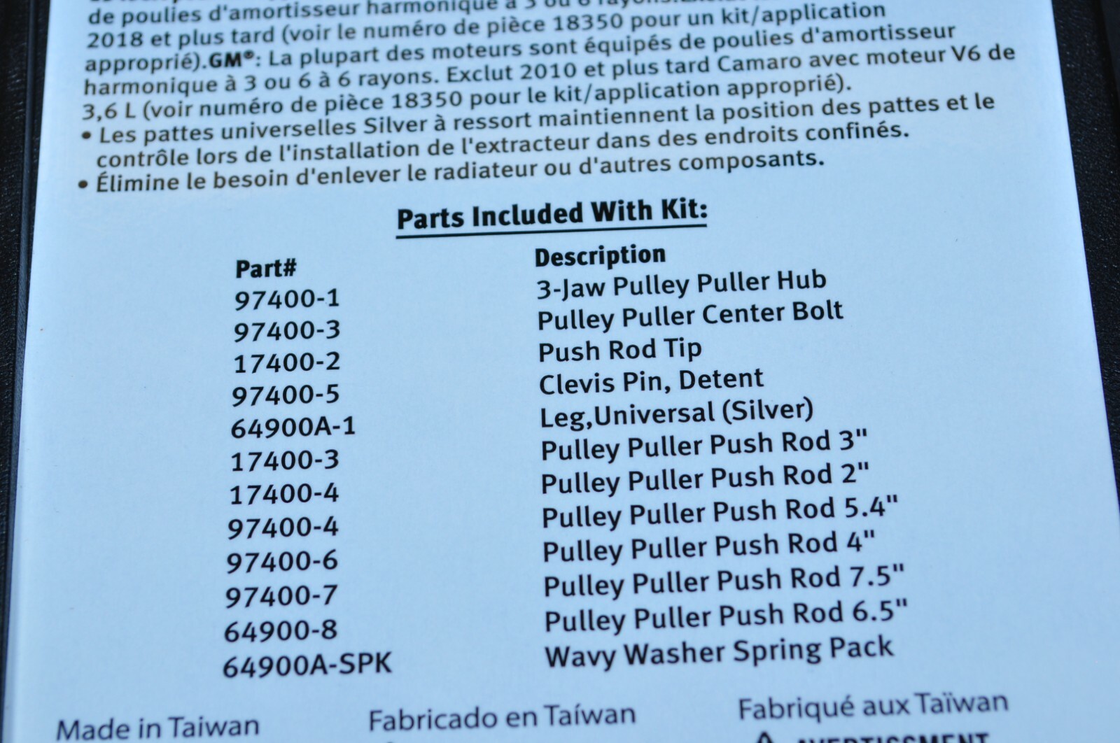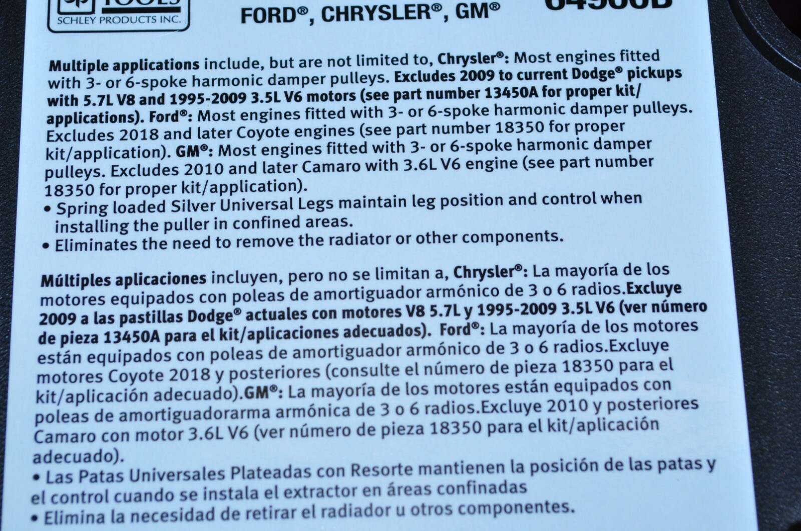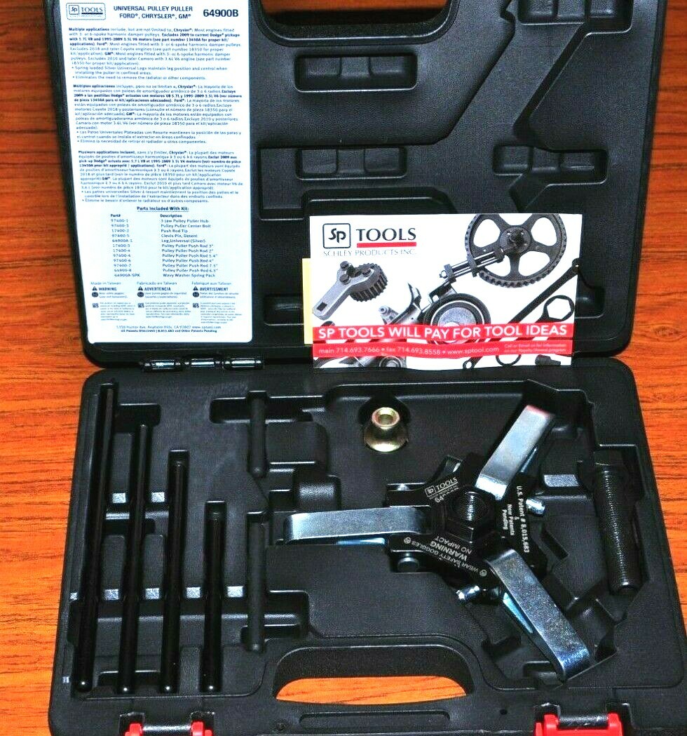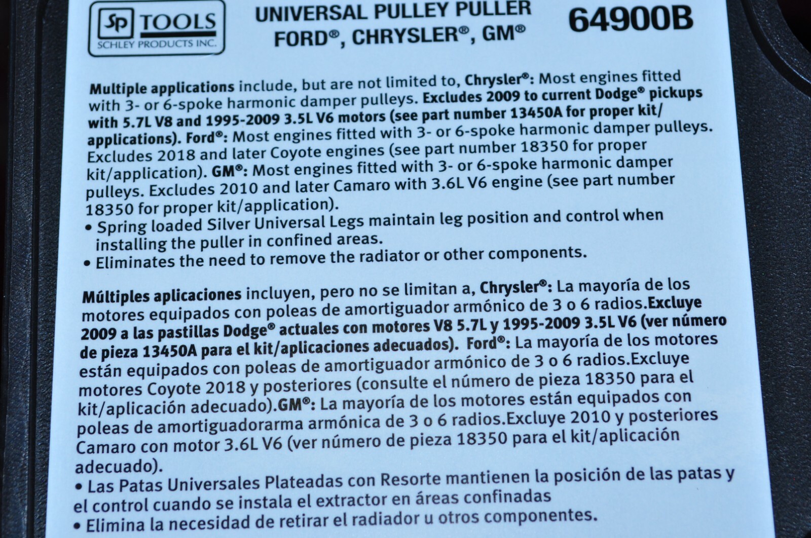 This unique tool has been developed to aid in the removal of the harmonic damper pulleys found on many Chrysler, and G.M. engines. This pulley is hard to access and remove due to space limitations in and around the engine compartment. In most cases this compact tool eliminates the need of a technician to go through the time consuming process of first removing the radiator or other components before being able to remove the pulley. This low profile puller has been designed for use on the following automobiles, SUV’s, vans & pickups: