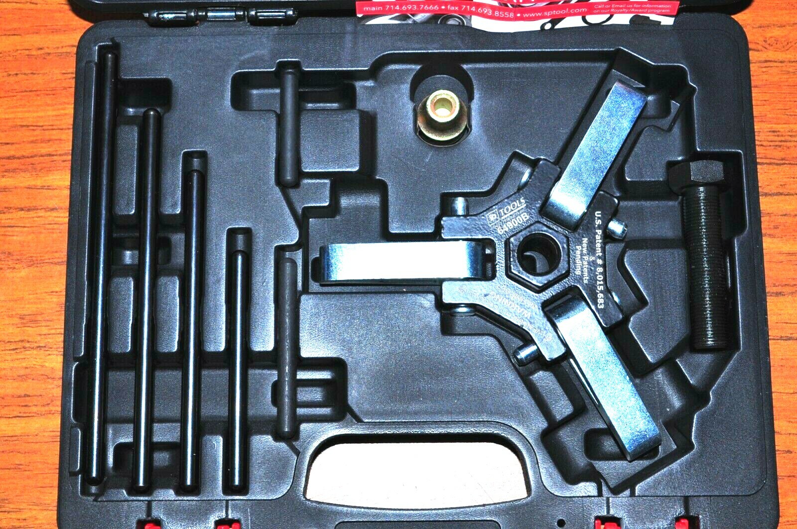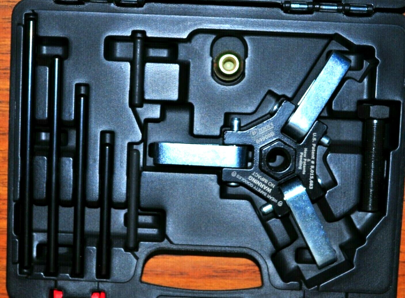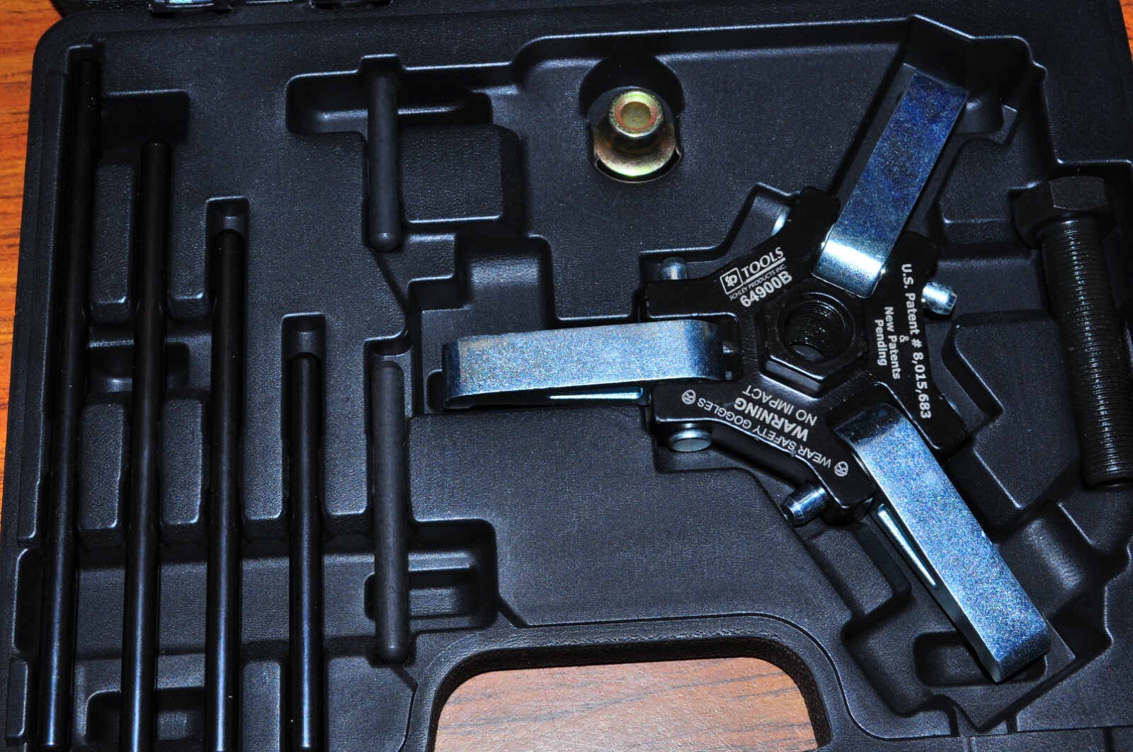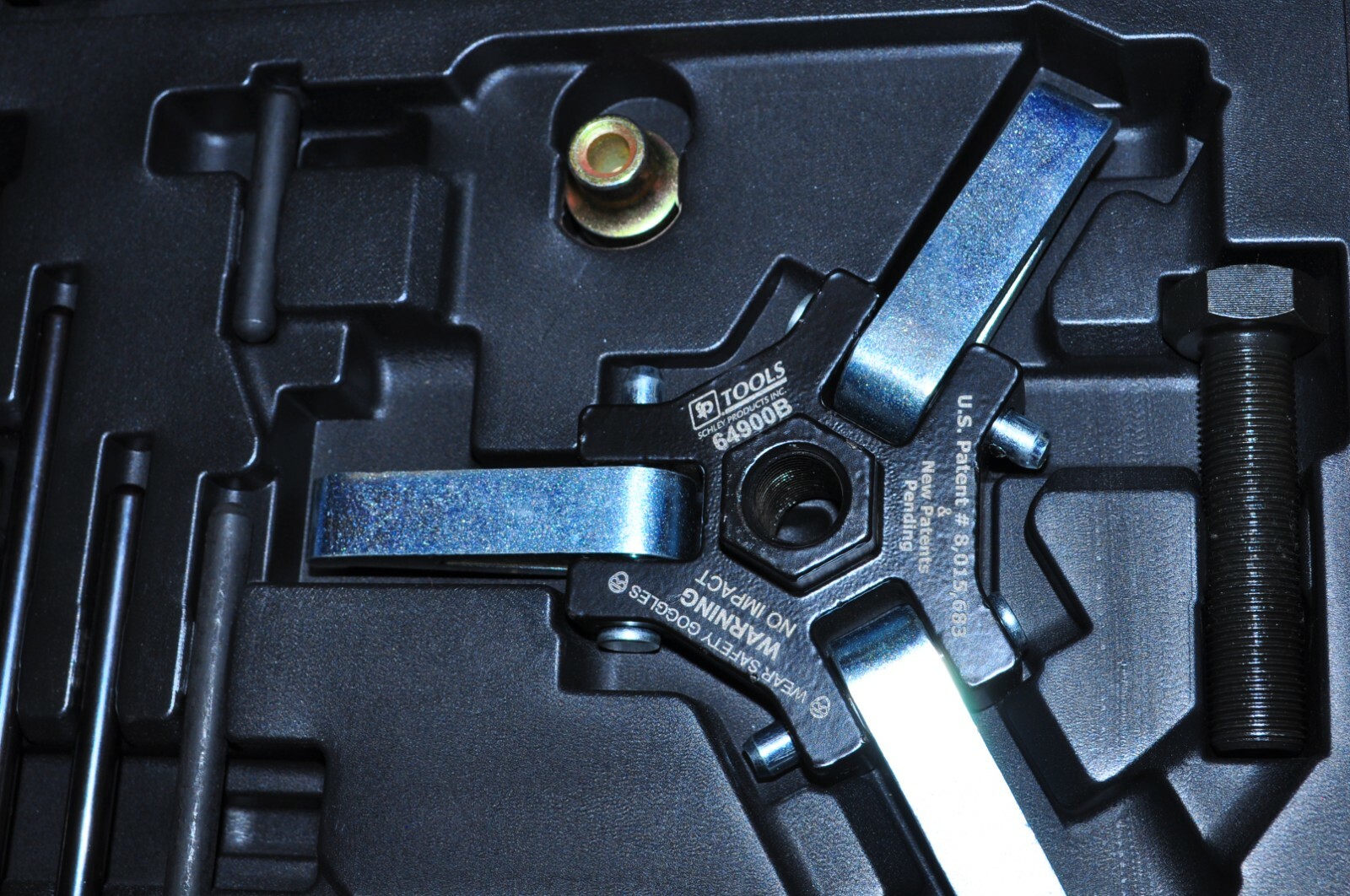 This unique tool has been developed to aid in the removal of the harmonic damper pulleys found on many Chrysler, and G.M. engines. This pulley is hard to access and remove due to space limitations in and around the engine compartment. In most cases this compact tool eliminates the need of a technician to go through the time consuming process of first removing the radiator or other components before being able to remove the pulley. This low profile puller has been designed for use on the following automobiles, SUV’s, vans & pickups: