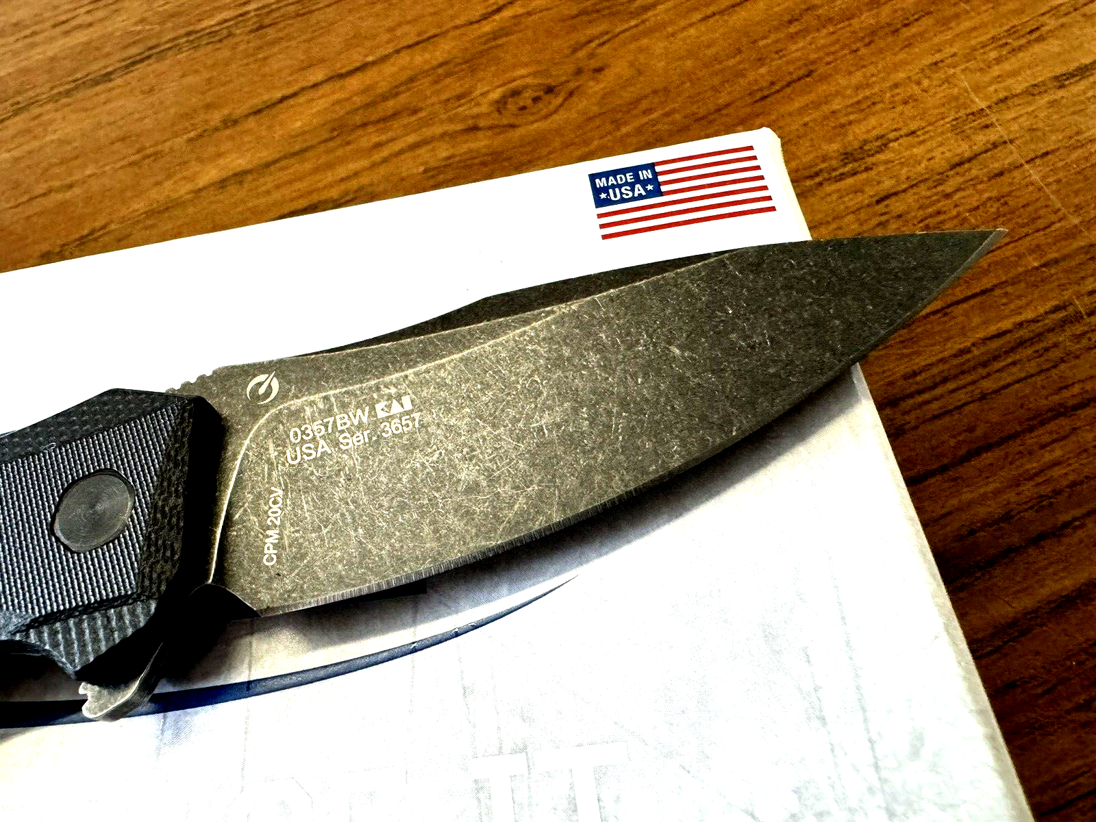 - CPM 20CV blade steel offers exceptional hardness, wear resistance, edge retention; blackwashed finish helps hide use scratches