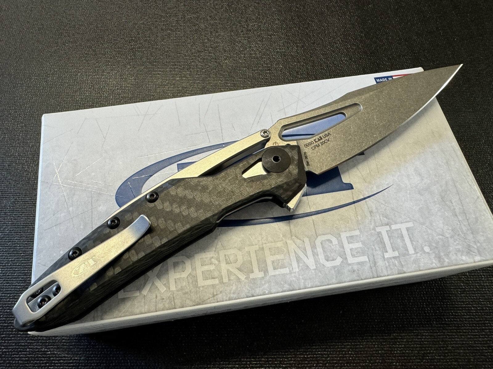 • CPM 20CV blade steel is heat-treated for exceptional hardness, wear resistance, and edge retention; stonewashed blade finish hides use scratches
